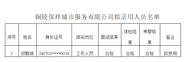 根據(jù)《銅陵保祥城市服務有限公司招聘公告》規(guī)定,經過報名、面試、體檢、考察等環(huán)節(jié),現(xiàn)將擬錄用人員公示如下(見附件)。